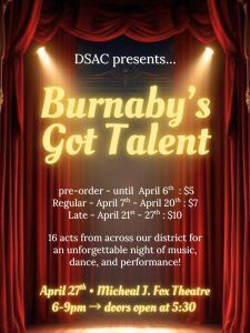 Mark your calendars! The District Student Advisory Council’s signature event will take place on Monday, April 27th at 6:00 PM at Michael J. Fox Theatre. This annual showcase of Burnaby’s finest talent will feature incredible performances, including singing, dancing, and more!