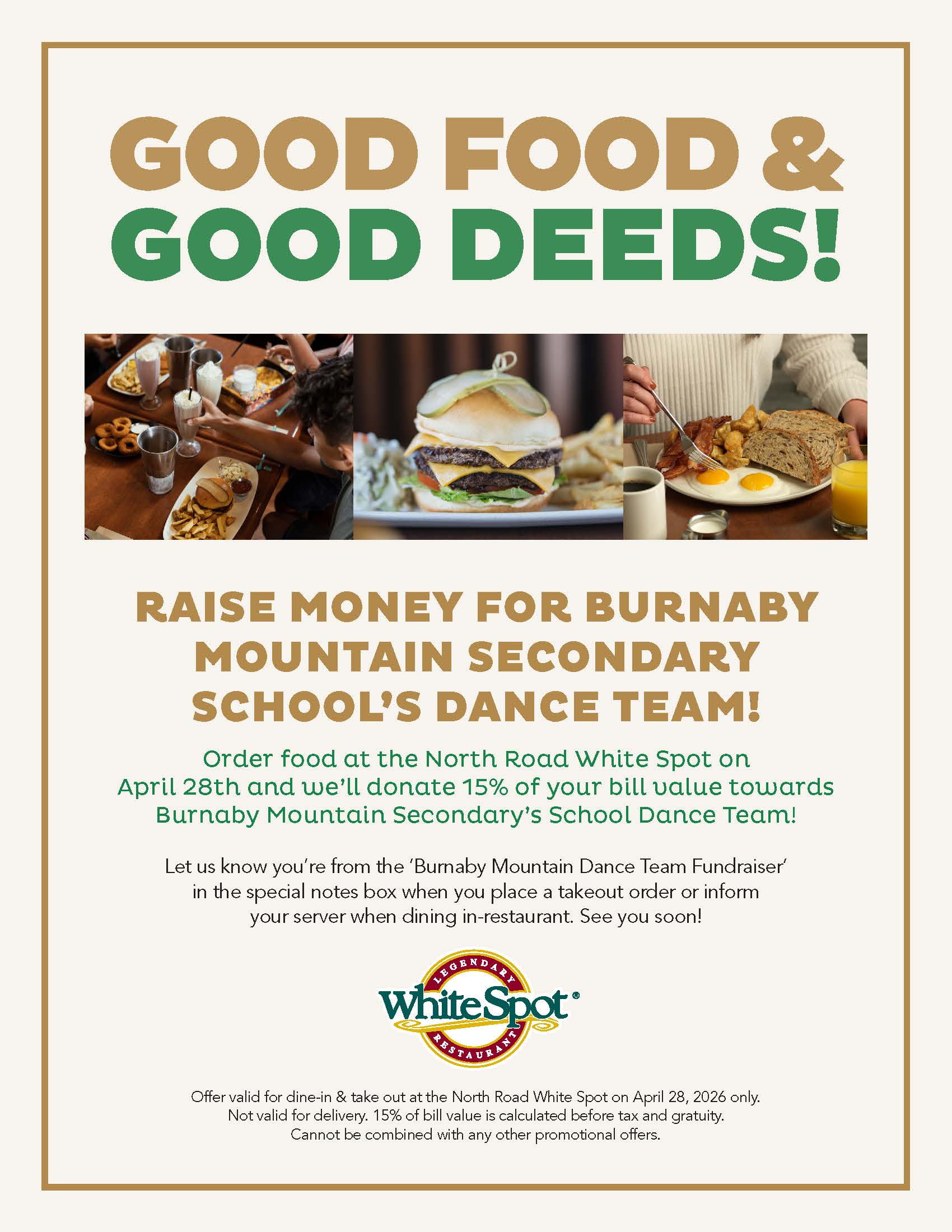 For those of you that are White Spot Restaurant lovers… dance students are running a family fundraiser on Tuesday April 28 from 7am-10pm at the White Spot on North Road. Just let your server know for dine-in or take-out service that you are supporting “Burnaby Mountain Dance”. A portion of the profits will go to the dance program to help us with costumes for our year-end show in May.